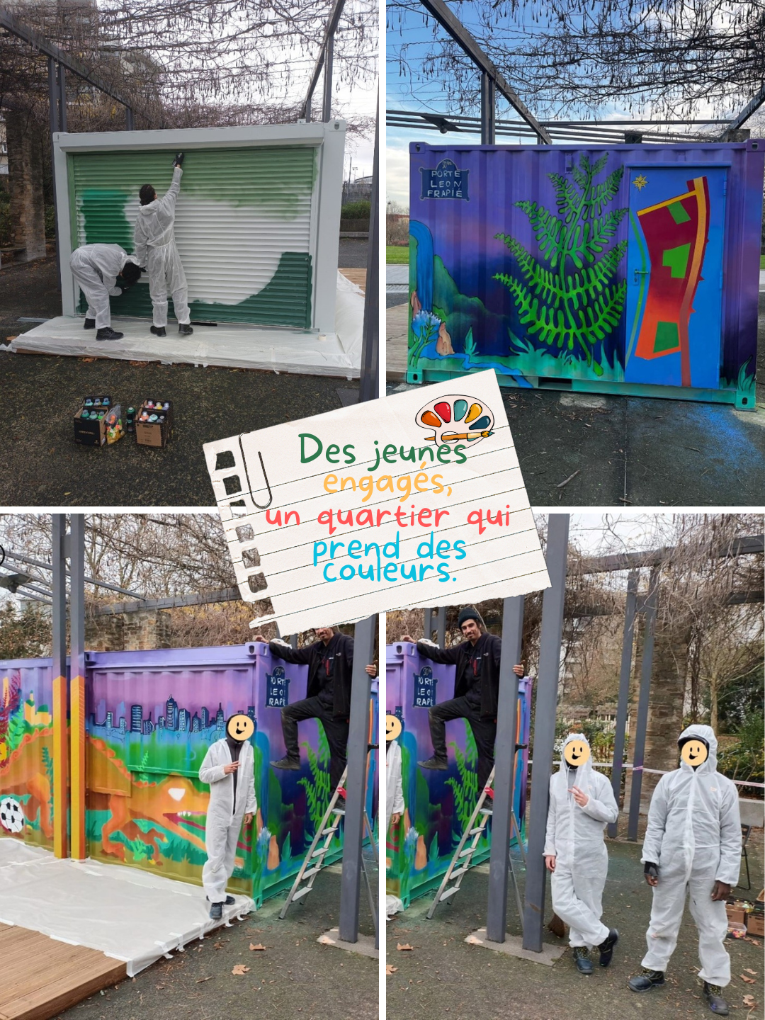 Encadré par l’équipe Jeunesse Feu Vert Fougères, ce chantier éducatif a permis aux jeunes de s’investir pleinement, tant dans les choix artistiques que dans la mise en œuvre technique.